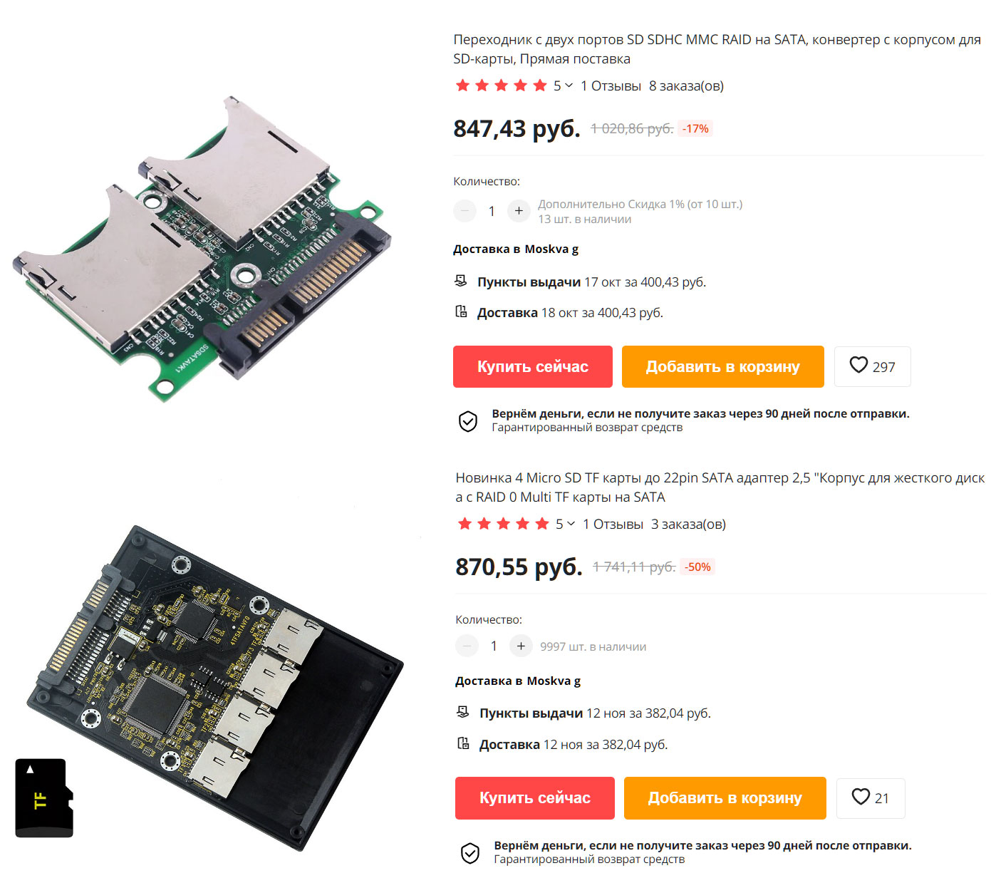 Так что покупается такой адаптер, в него вставляются 4 карты на 512ГБ , и на выходе имеем SSD диск на 2 ТБ с приемлемой скоростью и не очень высокой надёжностью. И ценой ниже чем полноценный SSD такого же объёма.