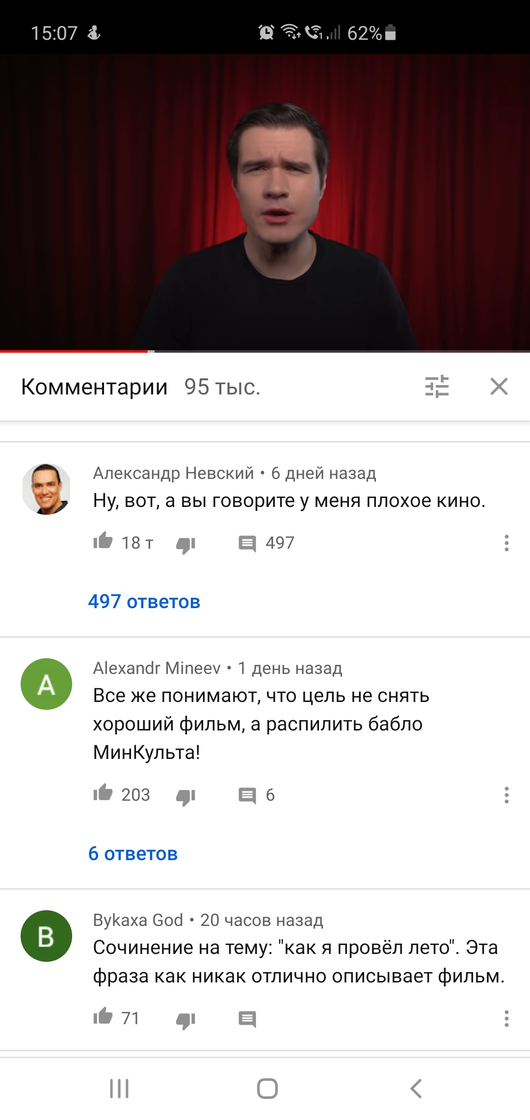 Во-вторых, от Саркисова в первую очередь зависел результат и финансирование. Большинство людей не видит целого, в отличие от режиссёра и продюсеров. Часть материала вообще не попадает в ленту. Так делается кино. За Саркисовым было последнее слово по части сценария и монтажа. Так что с него и спрос.