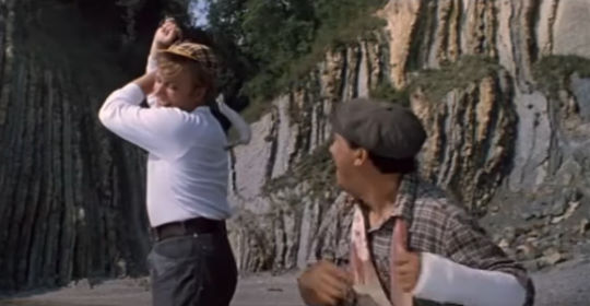 На рыбалке Геша Козодоев пытается оглушить Горбункова сначала специально приготовленной кочергой, а после её утраты — камнями.