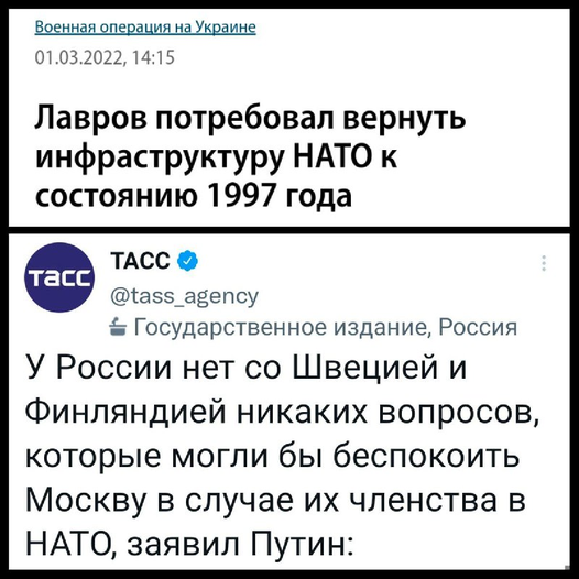 По словам Путина, расширение военной инфраструктуры за счет сил НАТО на территории обеих стран [Швеции и Финляндии, примечание моё] неминуемо вызовет «ответную реакцию» России, а их вступление в альянс может усложнить «и без того непростую обстановку в сфере международной безопасности».