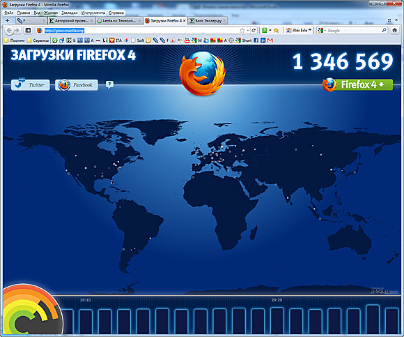 Поставил FireFox 4 (скачать). И сначала подумал, что случайно скачал Chrome - его влияние очевидно. Панель вкладок переползла наверх над адресной строкой - как в Chrome. Правда, их можно перенести на привычное место, но там они глючат - временами пропадают. Общий стиль оформления стал похож на Chrome. Работать браузер стал явно быстрее - тоже как Chrome. Сделали панель дополнений в виде вкладки. Меню убрали - как в Chrome. Но его можно включить обратно - оно будет маленькое и очень смущающееся.