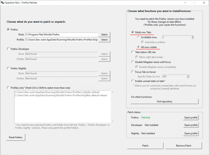 Так я, собственно, о чем. Стал восстанавливать вкладки в несколько строк, однако старый способ с заменой файла стилей userChrome.css почему-то перестал срабатывать. Стал искать, чем это все можно побороть. Нашел патчер, который четко сработал. Взять его под разные платформы можно вот здесь. Там ниже ищем раздел Assets и выбираем патчер под нужную платформу.