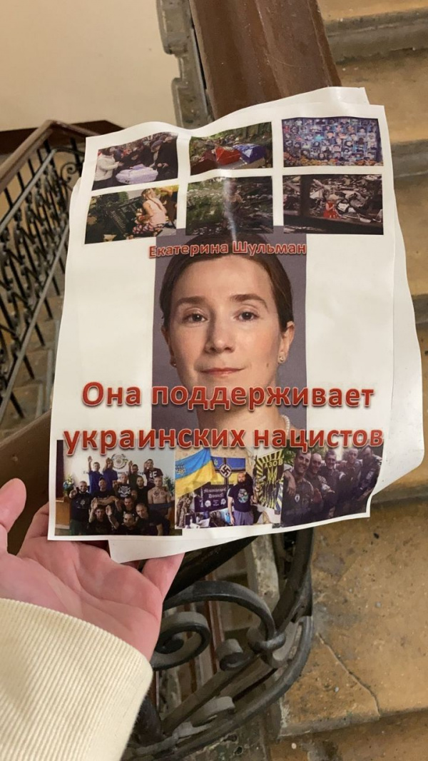 В доме, где когда-то (десять лет назад) жила Екатерина Шульман, повесили пару вот таких листовок.