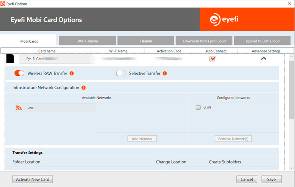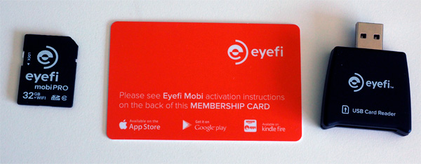 Подключается очень просто. С сайта скачивается и устанавливается приложение (айфон, андроид, десктоп), в приложении нужно выбрать Add an EyeFi Mobi Card, после чего нужно ввести код с пластиковой карты.