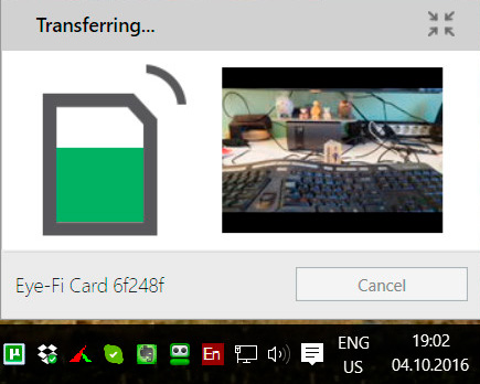 Ну и все. Далее карта вставляется в любой фотоаппарат, делаются снимки, а когда камера (с картой) оказывается в зарегистрированной сети Wi-Fi - снимки и видео автоматом переливаются на компьютер. (Включая RAW, а то какие-то предыдущие версии RAW не поддерживали.) Происходит это достаточно быстро (если сеть быстрая) - где-то по 3-5 секунд на кадр. Визуально процесс закачки отображается на компьютере справа снизу над областью уведомлений.