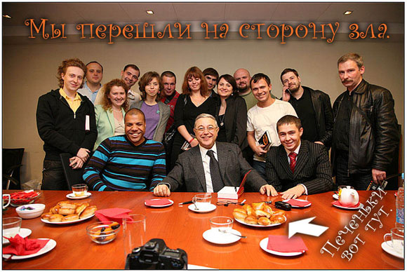 Ну вот, на деле все оказалось гораздо цивилизованнее, чем предполагалось. Петросян встретился с блоггерами, блоггеры поели сладкого и нашли взаимопонимание. Зря, конечно, Алекс, вы туда не пошли. Были бы уже на стороне зла, как все.