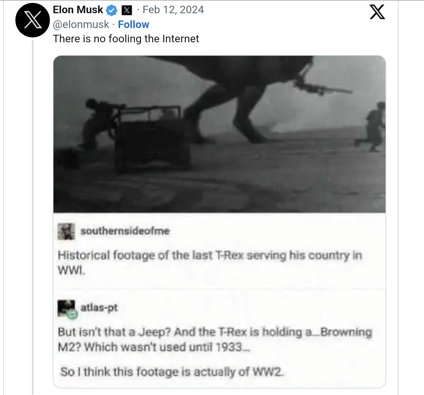 У Маска? Он привёл скриншот обсуждения, где один комментатор поправляет другого, что не WW1, а WW2. Своего масковского только текст вверху "Интернет не обманешь".