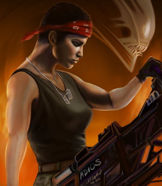Это "бандана", не "платок" 😉 И глаза у неё на оружие смотрят, а не фпол.