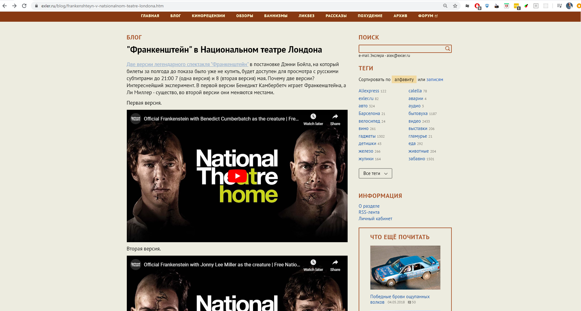 Четыре раза в кинотеатр ходил на эту постановку - просто гениально. Причём три раза из четырёх смотрел версию "Ли Миллер", где Ли Миллер - учёный, а Камбербэтч - существо. Камбербэтч просто великий.