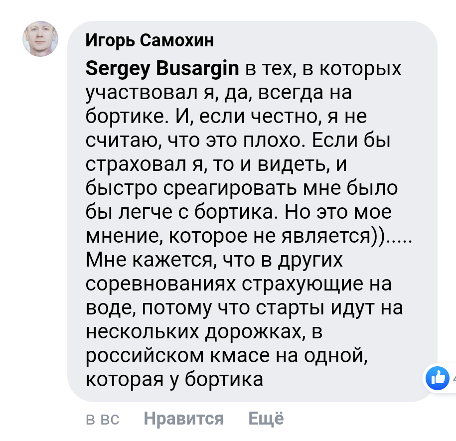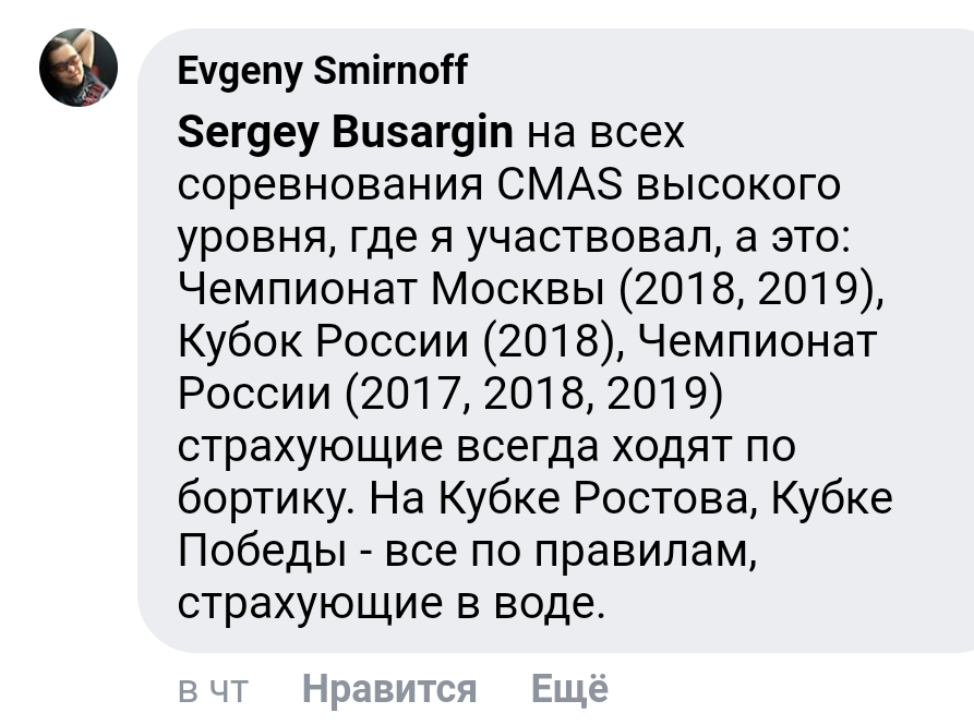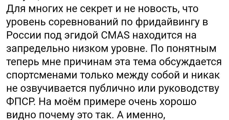 Для многих не секрет и не новость, что уровень соревнований по фридайвингу в России под эгидой CMAS находится на запредельно низком уровне. По понятным теперь мне причинам эта тема обсуждается спортсменами только между собой и никак не озвучивается публично или руководству ФПСР. На моём примере очень хорошо видно почему это так. А именно, предпринятая мной попытка конструктивного диалога с главным тренером сборной Зимовским П.А. по поводу инцидента со мной, который случился на Кубке России (ссылка на видео с соревнований в первом комментарии под этим постом), в котором явно видно весь тот дурдом, который происходит регулярно, но о котором все боятся говорить, помимо угроз, оскорблений, привела к тому, что меня отстранили по надуманной причине от соревнований до конца 2019 года. Тем самым лишив меня права бороться за медали на Чемпионате Европы 2019 (ссылка на документ также внизу под постом в первом комментарии). Пересказывать содержание разговоров, которые проходили через третьи лица, так как меня не считают равным себе или достойным личной беседы, не вижу смысла, могу лишь прикрепить письмо президенту ФПСР Аржановой А.В. (ссылка под постом в первом комментарии).