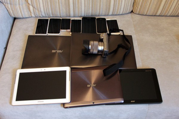 Подготовил все гаджеты, которые мне надо будет завтра взять с собой в рюкзаке в Испанию - в основном, это для обзоров, хотя там присутствуют и три моих рабочих телефона, ноутбук и планшет.