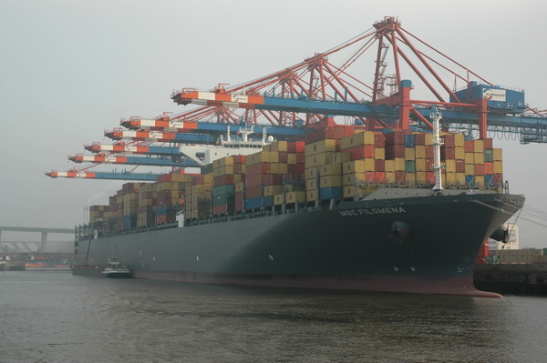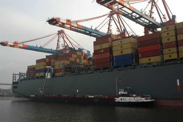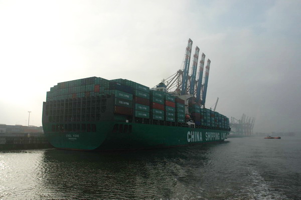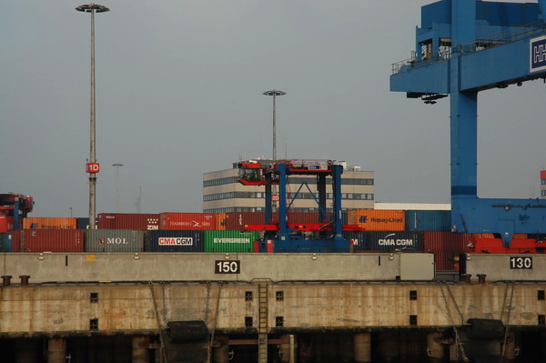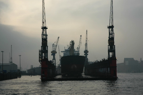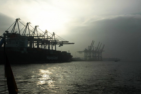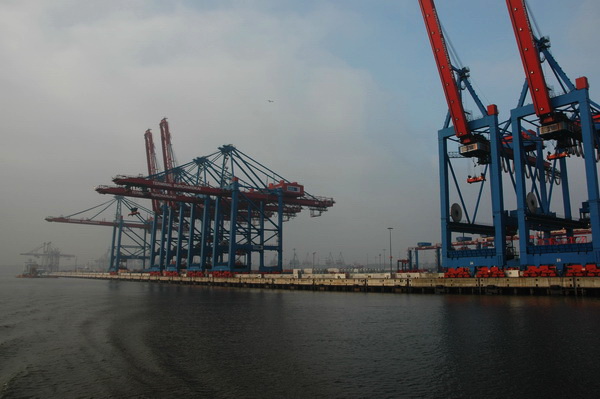 а краны-погрузчики, которые на фото, из Сингапура. их там производят и в полусобраном состоянии привезли в Гамбург.