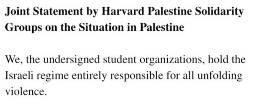 Вроде Гарвард, по идее не глупые ребята. Ну прям хочется ну напишите вы чего-то дежурное про народ Палестины, без упоминания террористической организации. Даже если мудаки и не хотите осуждать атаку на Израиль, ну просто не пишите про них. Короче ну и хрен с ними..