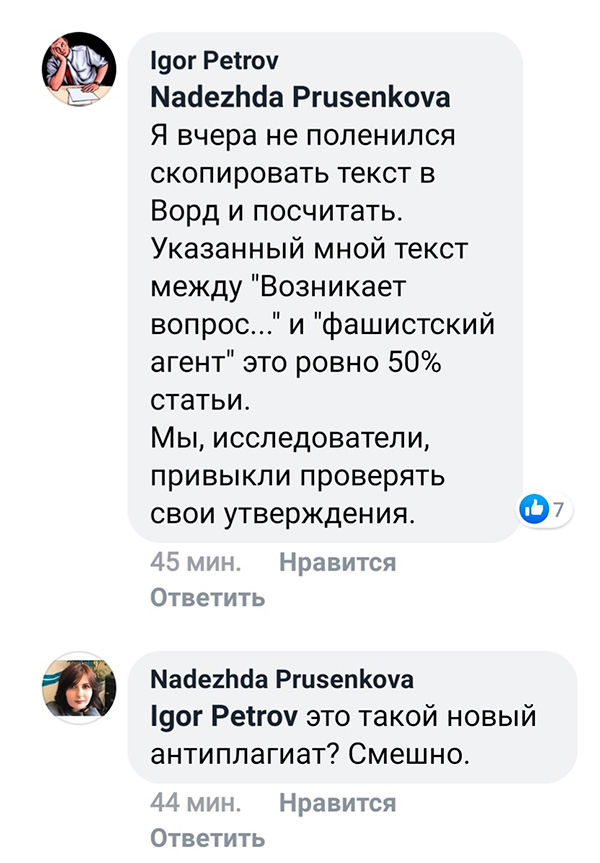 Интересно, я один сравнил текст статьи в «Новой газете» между слов «Возникает вопрос» и «..фашистский агент» с публикацией в ЖЖ Игоря Петрова, как призывает это сделать сам Игорь Петров? Перед тем, как гневно критиковать Поликовского, советую всем это сделать. На мой взгляд, там нет никакого плагиата. Что, конечно, не делает корректными по форме высказывания Прусенковой. Но по сути она права. А указать источник, если этого требует сам источник? Почему бы и нет, указали, и правильно сделали. Но вполне могли и не делать. Никто в здравом уме плагиат в данном случае не обнаружит