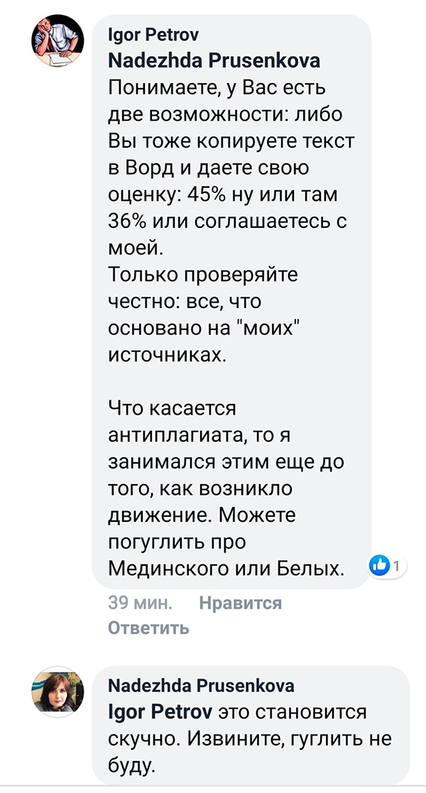Игорь пишет о том, что Поликовский просто-таки скопировал 50% его статьи. И знаете что на это отвечает данная прелестная женщина?