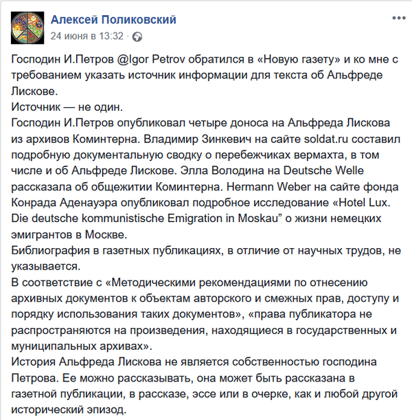 История Альфреда Лискова не является собственностью господина Петрова, факт. Но именно он эту историю раскопал и опубликовал. Именно его материалы послужили основой статьи в "Новой". Ну да, Поликовский также мог пользоваться и другими материалами, но сути дела это не меняет - вообще всю эту историю он взял из ЖЖ Игоря, причем он в статье цитировал именно его текст, причем простейший анализ показывает, что там прямые совпадения до 50%.