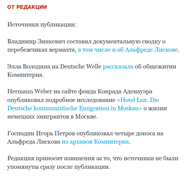 Upd: Типа как достигли компромисса. Но история менее неприятной от этого не становится. Особенно хороши там этот Поликовский и Прусенкова. И, кстати, я в упор не понял, в чем там компромисс. Ссылка стоит с таким же хамским комментарием, как и вчера: " Господин Игорь Петров опубликовал четыре доноса на Альфреда Лискова из архивов Коминтерна". Впрочем, это дело Петрова, как на это реагировать.