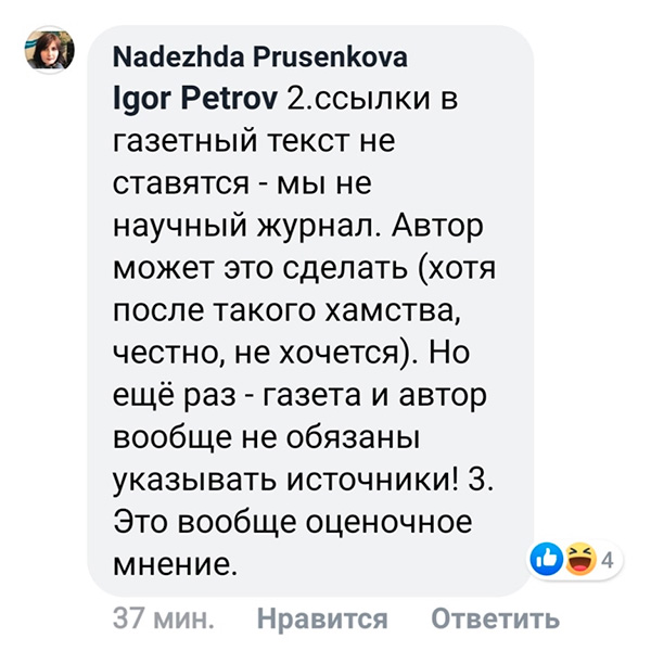 Когда Игорь увидел эту статью в "Новой", то он вежливо поинтересовался у Алексея Поликовского, по какой причине тот не счел нужным поставить ссылку на пост Игоря. Больше ничего он от него не требовал. И получил вот такой странный ответ - зацените сам тон и подачу.