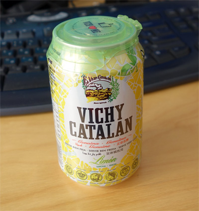 Каталаны - молодцы! Мало того, что стали выпускать в жестяных банках свою газированную воду "Виши каталан", так еще додумались делать на банках вот такие пластиковые крышечки. Очень удобно: крышечку открыл - верх банки чистый, можно прямо из банки пить.