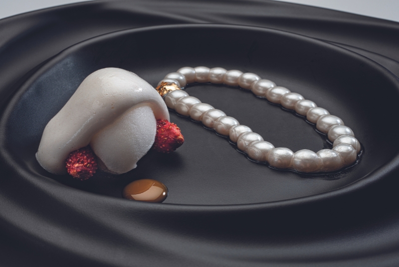 Как и полагается для трехзвездного мишленовского ресторана, это вообще не про еду. А про красоту, воплощенную в еде. Вот, например, одно из их блюд. Ожерелье изготовлено из вытяжки поджелудочной железы сибирского подкустового выползня, а землянику изображает цветок экзотического растения Выбегония Климонадная.