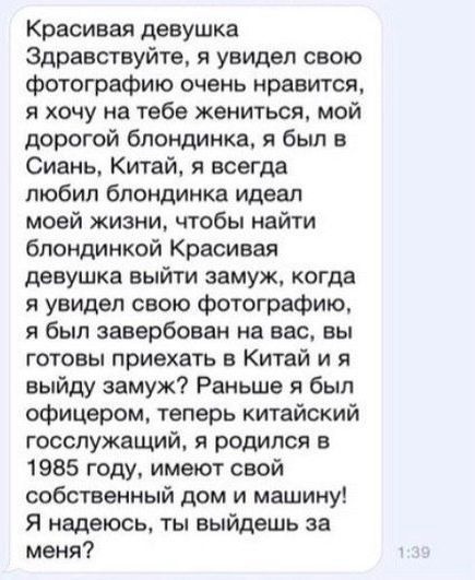 Не знаю, как насчет американцев, но вот в Китае из-за политики "одна семья - один ребенок" сейчас переизбыток в 30 миллионов китайских мужчин. А в России полно незамужних женщин. И одинокие китайцы засыпают россиянок такими письмами. Российско-китайские сайты знакомств и брачные агентства сейчас переживают бум.