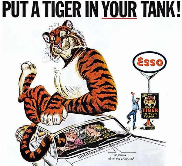 Находки в рекламе, удачный образ высоко ценятся. В Нью-Йорке мы видели объявление на картонке: "Любителям тишины: в нашем кафе музыкальный автомат сломан. Заходите". Это находка копеечная. А может находка принести и многие миллионы. Известна история с добродушным тигром, которого находчивые художники-мультипликаторы засунули в бензиновый бак автомобиля, и он там урчал примерно так же, как урчит исправный, сильный мотор. "Посадите тигра в ваш бензобак - заправляйтесь у компании "Эссо"!" Несколько лет, к зависти конкурентов, "Эссо" пожинало урожай от удачной рекламы - все хотели посадить тигра в свой бензобак, особенно жены и дети, сидящие рядом с водителем. Полосатый оранжевый тигр мчался вперед на дорожных щитах и щурился добродушно: "Не забудьте посадить в бензобак..." Василий Песков, Борис Стрельников «Земля за океаном».