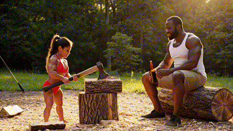 Вот еще промпт: "Миловидная миниатюрная брюнетка огромным топором рубит дрова, а рядом сидит атлетически сложенный мужчина, который попивает пиво из бутылки".