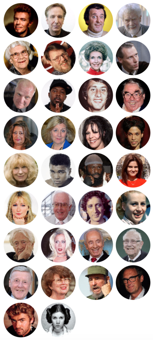 Ровно такие же дела, как и все предшествующие годы. Знаменитости умирают регулярно. Ткну пальцем в 2016-й, например:
