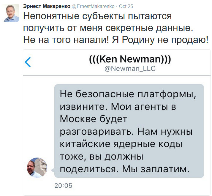 Ну и запомните, если кому нужны КИТАЙСКИЕ ядерные коды - то это к Макаренко. ФСБ и психиатров должно заинтересовать, надеюсь поделят, чей это пациент.
