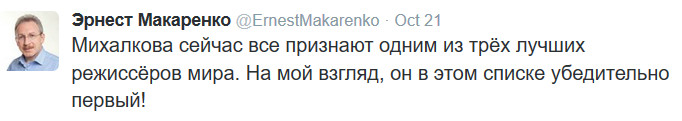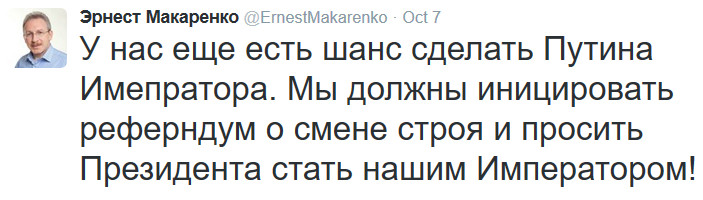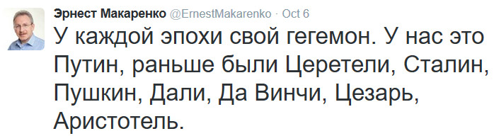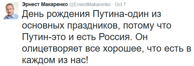 Из его твита: "Какое счастье, что мне повезло жить и реализовывать себя в эпоху Путина. Мы слабо пока понимаем, как нам повезло."