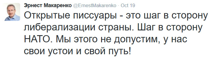 Открытые писсуары - это шаг в сторону либерализации страны. Шаг в сторону НАТО. Мы этого не допустим, у нас свои устои и свой путь!