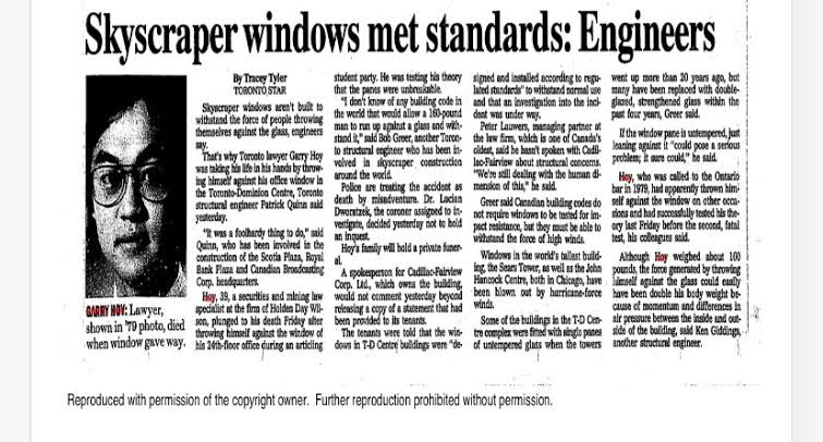 9 июля 1993 года Гэрри вел прием для студентов-юристов, заинтересованных в стажировке в Holden Day Wilson. Во время экскурсию по этажу ему снова задали этот вопрос, и Гэрри решил продемонстрировать свой любимый трюк: броситься на окна башни Toronto-Dominion Bank Tower, чтобы студенты могли убедиться, насколько прочным является стекло.