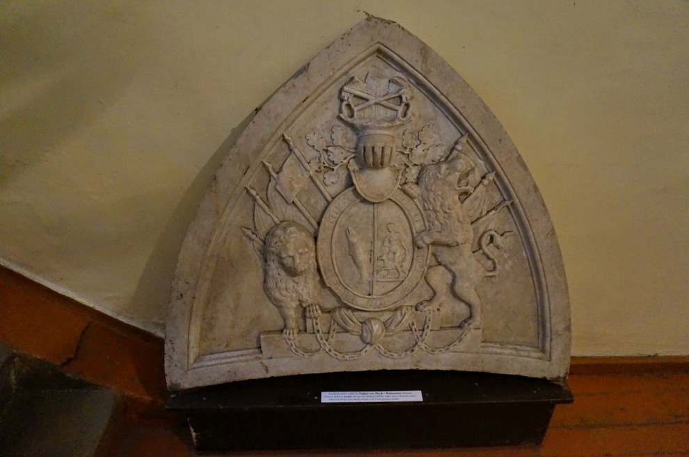 Внутри висит герб первого владельца. Его девиз: "Не отступать и не сдаваться, найти залив и там купаться". А вот девиз Платона Зубова: "Нужно хорошо учиться и слушаться маму". Школьники хорошо знают эти два девиза и часто воплощают их в своих картинах.