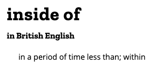 В Британии "inside of" употребляется, но когда речь идет о промежутке времени ("within, in less than the whole of, referring especially to a period of time ..."), например, "They promised to return it inside of a month".