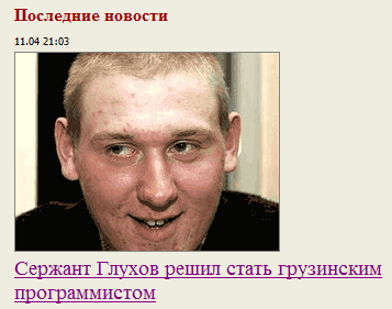 З.Ы. В армии не служил (и похоже теперь и не буду по здоровью), судить его не буду. Единственное, что раздражает - такое внимание к персоне Глухова. Нашли нам козла отпущения и виновника всех бед, начиная от вымирания динозавров и заканчивая глобальным потеплением. Лучше бы что-нибудь существенное освещали.