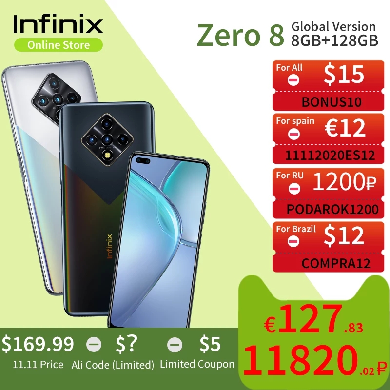 Взял дочке Infinix zero 8 За 12500. Получилось чуть дороже, чем в рекламе из за цвета. Черный дешевле. Ну и промокод на картинке почему то не сработал. Пришлось использовать другой - MNOGO он сработал.