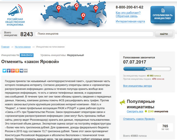 Ну на антикоррупционную инициативу #20 положили же болт. И на эту положат (а вообще там есть список инициатив, набравших 100 тысяч голосов - реализовано меньшинство). Вернее на федеральном уровне рассмотрят, что не рассмотреть. На какой коллегии какого министерства. И примут резолюцию: "отменять антитеррористический пакет не целесообразно".