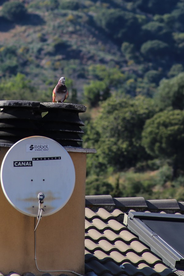 Может это голубь сам перекрасился под попугая.
