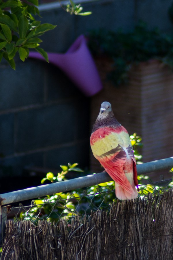 Ребенок высказал предположение, что это плод любви соседского попугая и голубицы, но я считаю, что тут все прозаичнее - голубца просто покрасили. А вот кто и зачем - непонятно совершенно.