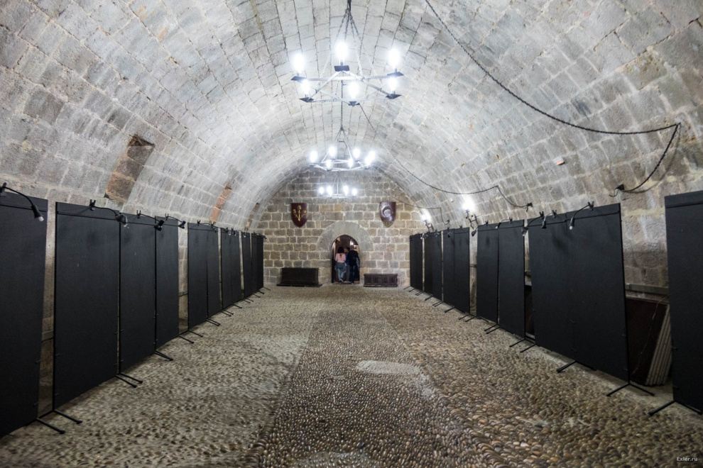 Вышли из церкви, направились в замок. Там открыты несколько старинных помещений с небольшими экспозициями. Вот в этом зале собирались рыцари: бражничали и рассказывали анекдоты.