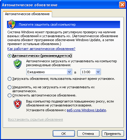 В Windows XP, как известно, автоматическое обновление рекомендуется выставлять в режиме полного автомата - мол, пускай сама скачает и сама установит.
