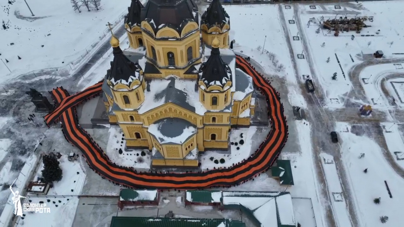 Активисты "Волонтёрской роты боевого братства" собрались на Стрелке и растянули трёхсотметровую Георгиевскую ленту вокруг кафедрального собора Александра Невского. В мероприятии приняла участие одна тысяча человек.