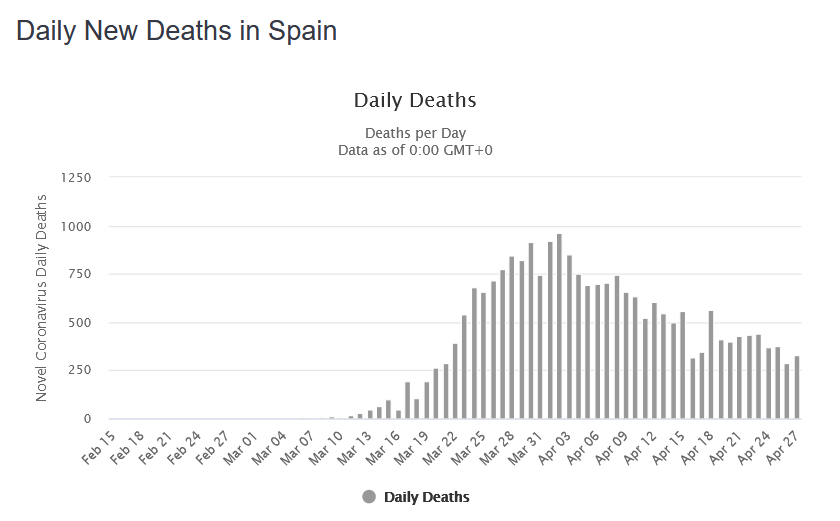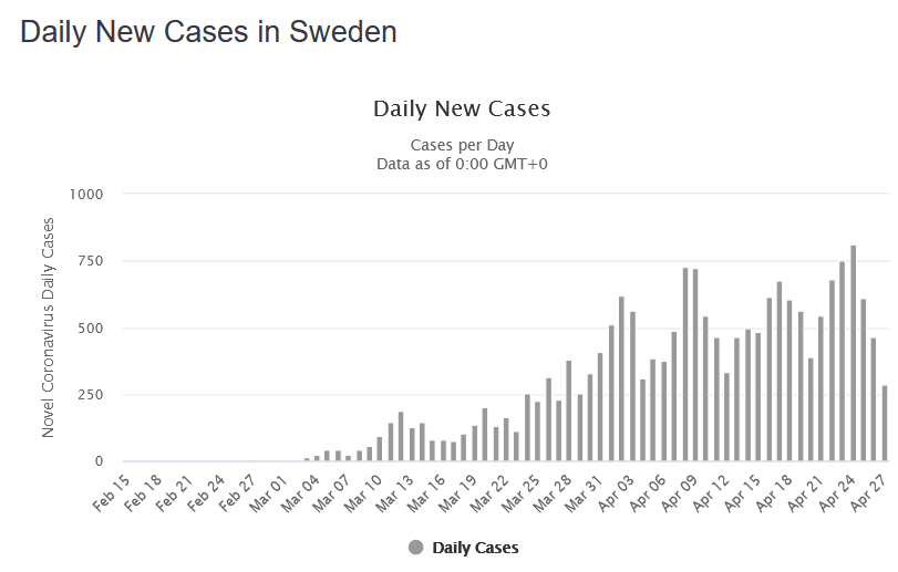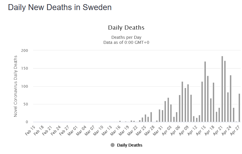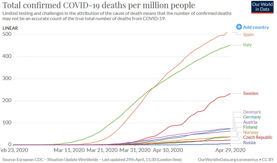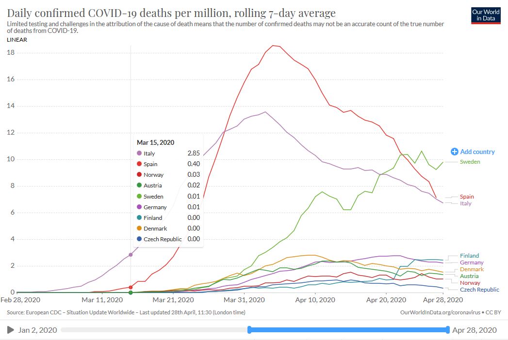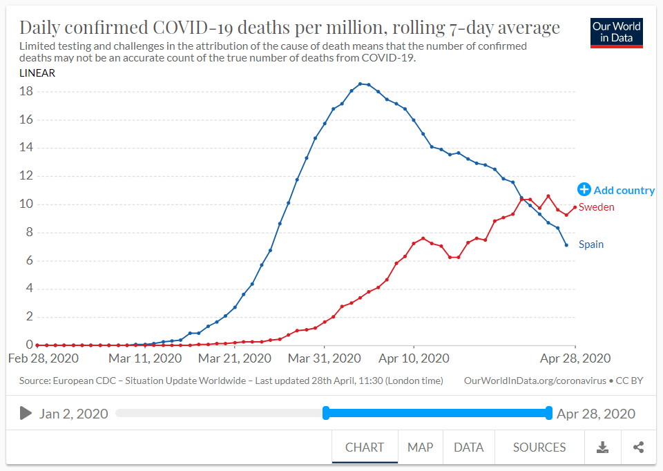 Нужно учитывать, что население Швеции примерно в 5 раз меньше населения Испании. И если оценивать смертность в пике с учётом популяции, то в обеих странах она получается практически одинаковая.
