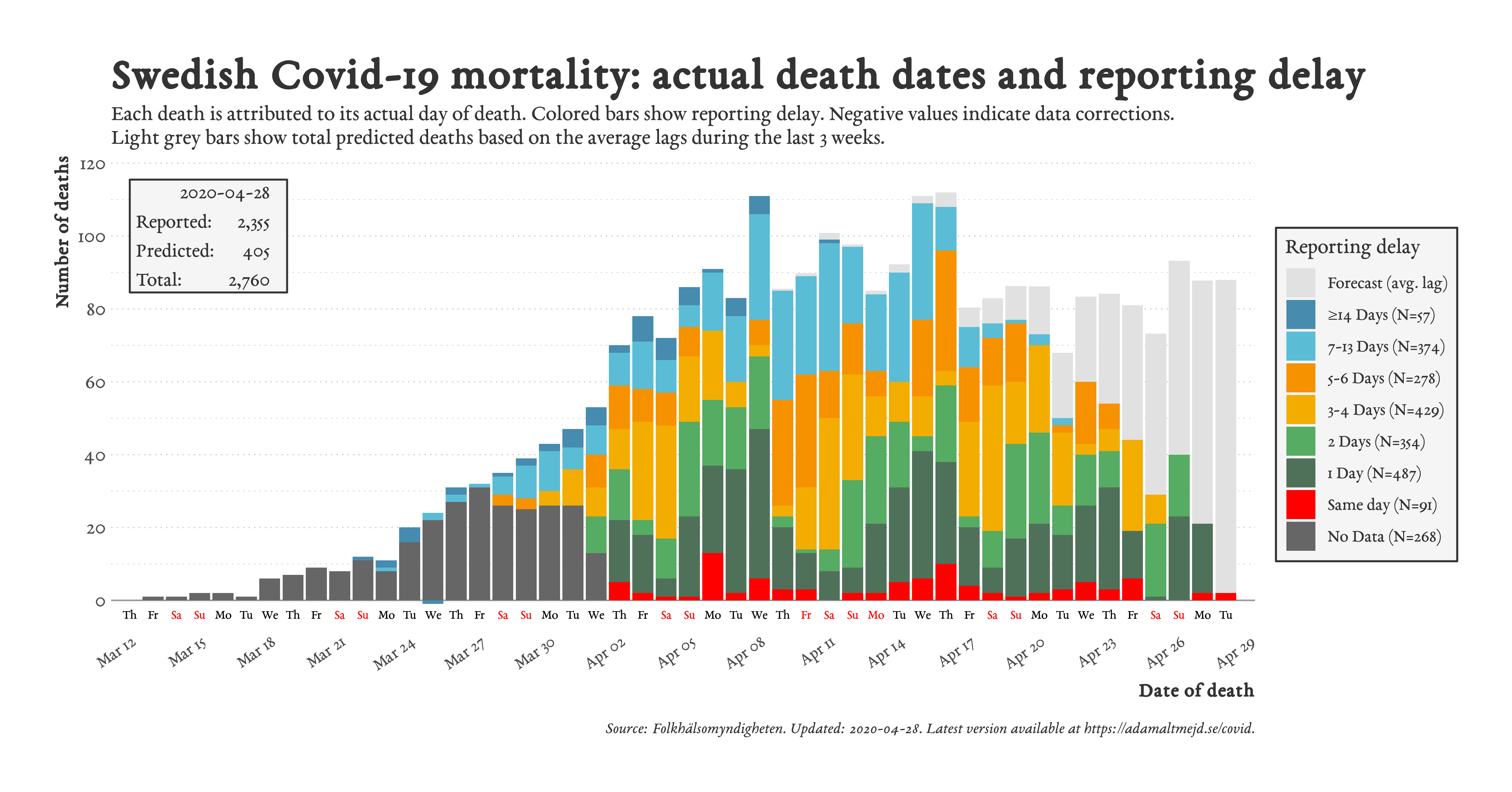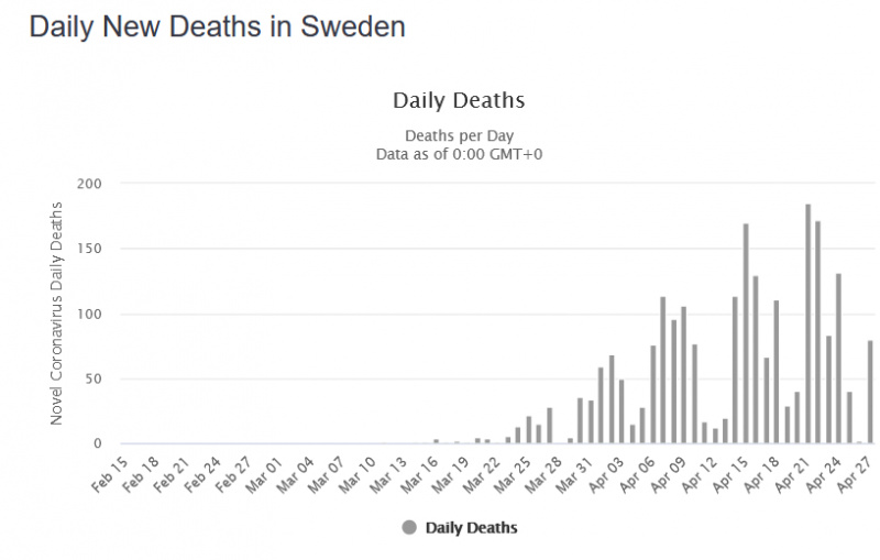 "Человек умер, например, в среду, но зарегистрирована эта смерть будет лишь после подтверждения причины. Это подтверждение займёт ещё, например, пару дней. В пятницу заключение будет отправлено в центр. И только в следующий понедельник оно появится в статистике. Графики регистрации уже вызвали массу шуток в интернетах, что шведы стараются не умирать по выходным, и делают это лишь в случае крайней необходимости".