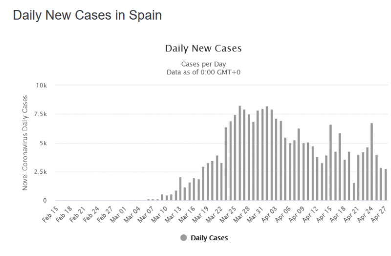 Spain: A loosening in four phases, with rural areas, the Balearic and Canary islands allowed to move faster than the cities. Bars and restaurants will be allowed to run at 30% capacity if they have outdoor space. Т.е. никаких особых контролируемых мер.