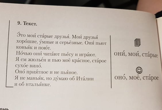 Наконец-то жизненный учебник издали, а то эти "Мама мыла раму" и "Маша ела кашу" - сколько лет живу, так ни разу и не пригодились. А вот "пью моё красное старое сухое вино" - неоднократно, ещё бы хорошо про шампанское что-то добавить, оно тоже "приятное и не пьяное"