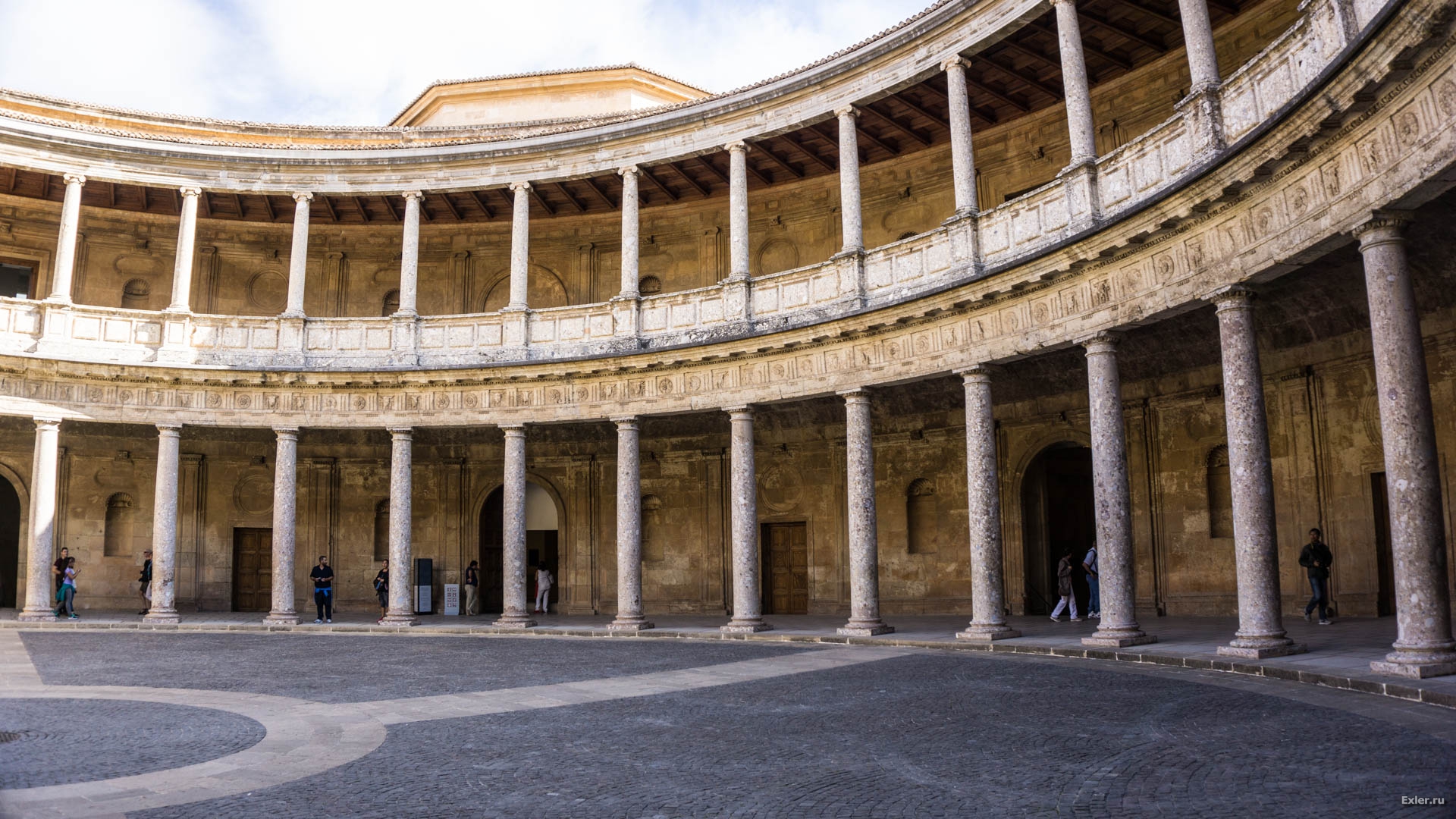 А внутри дворца неожиданно - большая площадь с ионической колоннадой на верхнем этаже и тосканскими колоннами на нижнем. Вероятно, там Карлос V выступал перед благодарными слушателями.