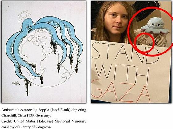 В первой половине XX века осьминог использовался в антисемитских карикатурах как символ мировой господства евреев. Антифашистские активисты пришли к выводу, что Грета Тунберг не могла задействовать такой мощный символ случайно.