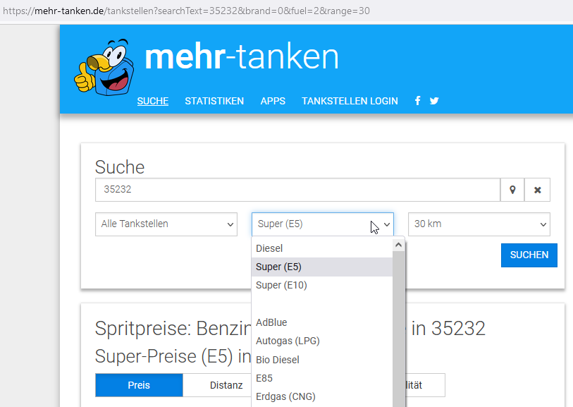 Вот пример ценового поиска с видами топлива: