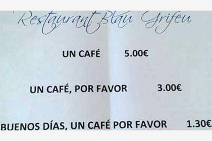 Кафе Blau Grifeu в испанском городе Льянсса установило цену на кофе и десерты ниже для вежливых посетителей и выше — для невоспитанных. Об эксперименте в пятницу, 2 сентября, пишет The Independent.